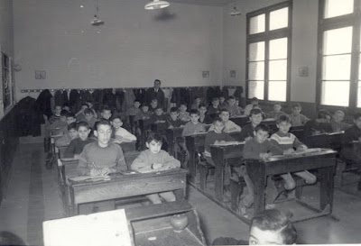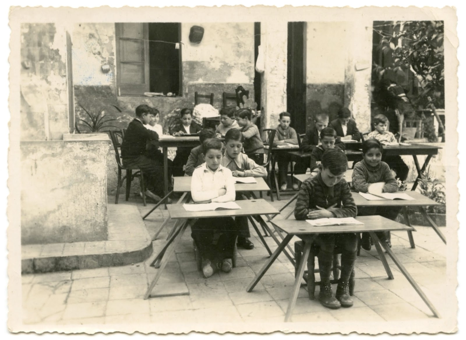 Mestres, alumnes, llibres, llibretes, treballs i edificis es poden veure