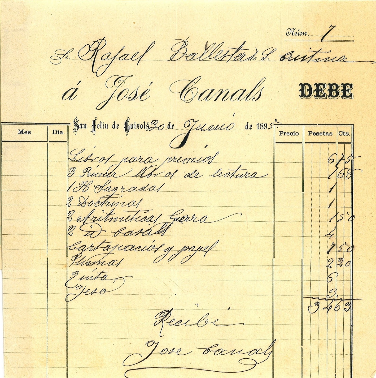 Factura de les classes de dibuix del Colegio Bagurense de 1883
